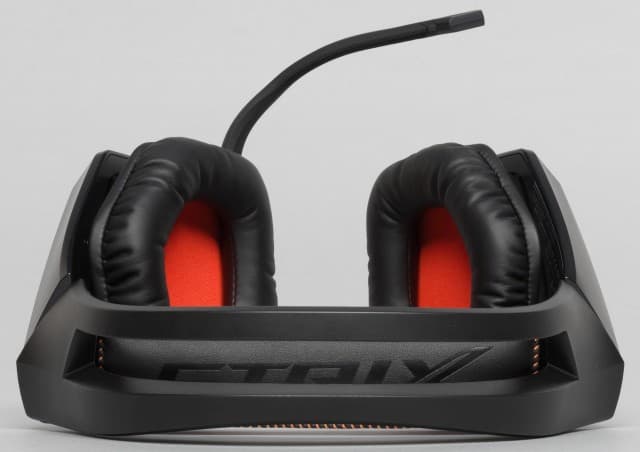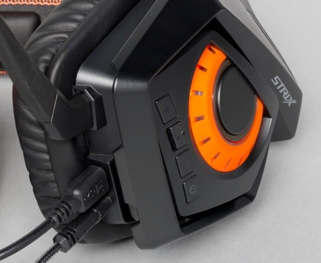 Красиво выглядит надпись Strix, будто высвеченная разноцветными неоновыми лучами. Хорошо видимая через прозрачный пластик чашка гарнитуры повернута на 90 градусов, и на зрителя взирает оранжевый глаз совы.