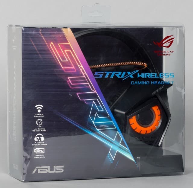 Гарнитура Strix Wireless поставляется в интересной упаковке. Сама гарнитура размещается в пластиковом ложе, установленном в картонную коробку с открытой фронтальной частью, и все это упаковано в прозрачную пластиковую обложку. Упаковка строгая, но хорошо будет заметна на полке магазина.