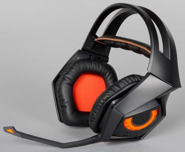 Чашки можно развернуть на 90 градусов, и тогда на зрителя будут смотреть сразу два совиных глаза. Правая чашка движется только против часовой стрелки примерно на 110 градусов, а ниже оранжевого глаза имеет серебряную гравировку и эмблему ROG. На левом же ухе помимо яркого оранжевого глаза расположились кнопки для регулировки уровня громкости звука, включения и выключения беспроводного режима и тумблер для включения и выключения микрофона.