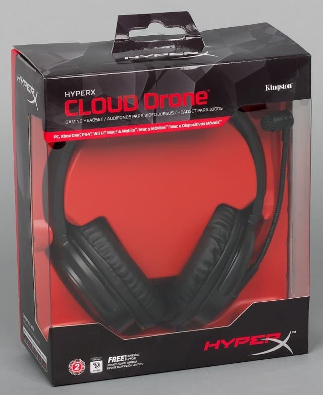 Гарнитура HyperX Cloud Drone поставляется в компактной коробке, окрашенной в чёрные, серые и красные цвета.