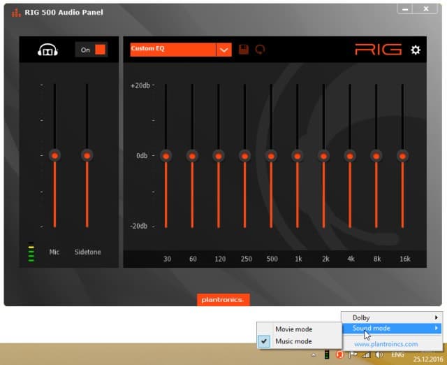 Помимо этого, вы можете открыть окно программы RIG 500 Audio Panel. В нём также есть общий выключатель Dolby, регулировки уровня записи с микрофона и системы подавления эха, десятиполосный эквалайзер с тремя готовыми пресетами (сценария игр нет и здесь) и пятью слотами для пользовательских настроек. В опциях программы можно отключить основной значок в трее, выбрать язык (русского в списке нет), настроить прозрачность окна программы. В целом всё это выглядит не очень удобно и полезно. Что касается впечатлений о звуке при использовании программы, то они будут описаны далее.