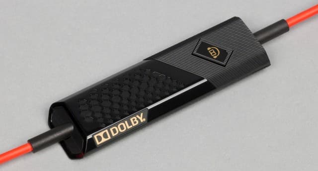 Интересно, что здесь использованы более удачные муфты для защиты кабеля — из мягкого материала. А сам кабель аналогичен использованному на чашках, только толще. На корпусе вставки присутствует логотип Dolby Digital золотого цвета, одна кнопка, которая может быть использована для включения/выключения обработки звука Dolby (правда вот тянуться за ней придётся долго), а также светодиодный индикатор белого цвета, включенный во время её работы.