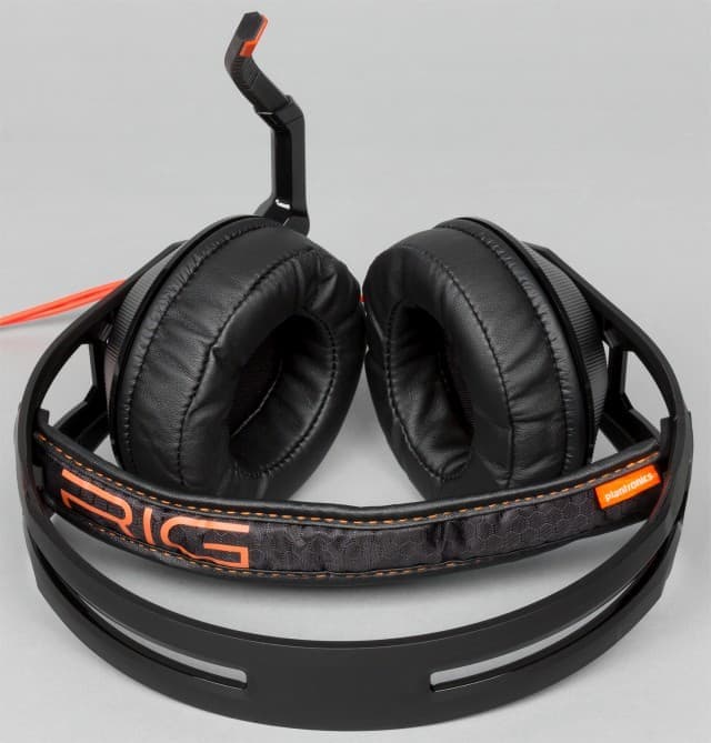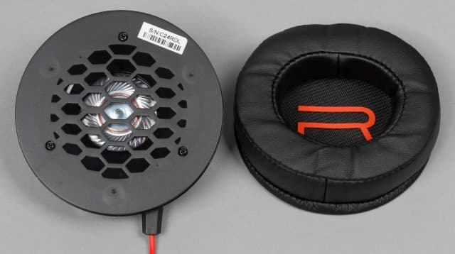 Комплектные чашки имеют звукоизолирующую конструкцию и изготовлены из чёрного матового пластика с интересной фактурой. В качестве дополнительных элементов дизайна здесь есть оранжевое кольцо около крепления к оголовью и выступ с надписью RIG. Диаметр чашек составляет около 90 мм. Внутри используются 40 мм излучатели, хотя мы бы скорее говорили о 35 мм.