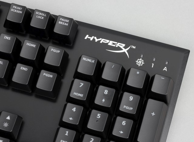 В правой верхней части находится выгравированный логотип HyperX, а правее него — светодиодные индикаторы Win Lock, Num Lock, Caps Lock.