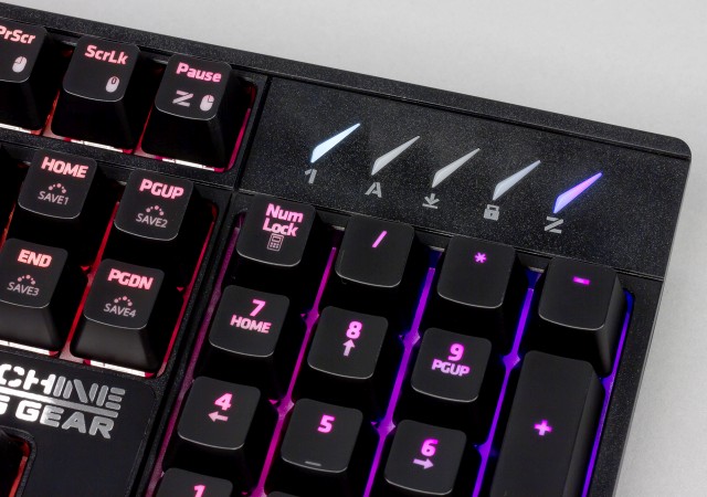 Ярким акцентом на фоне чёрной поверхности клавиатуры смотрится алюминиевая панель с вырезанной надписью Z-Machine Gaming Gear, размещённая сразу над блоком курсорных стрелок.