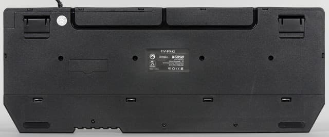 На дне можно заметить две крупные резиновые вставки в передней части. Однако по факту они не плотно контактируют со столом, так что в реальности удерживают клавиатуру не очень хорошо.