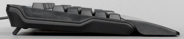 На задней стороне клавиатуры есть два откидывающихся упора для изменения угла наклона относительно поверхности стола и четыре пластиковые вставки по углам, которые должны препятствовать скольжению.