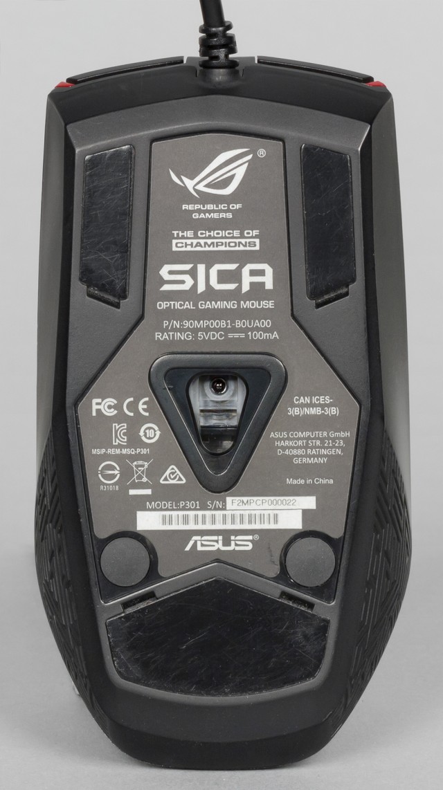 На дне мышки расположены три пластины из тефлона, обеспечивающие минимальное сопротивление при скольжении по коврику.