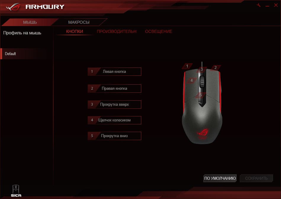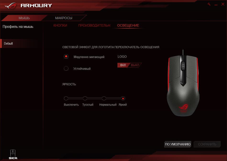Для линейки периферии ROG применяется универсальная утилита Armoury, которая даёт возможность изменять разрешение оптического сенсора, управлять подсветкой, создавать макросы.