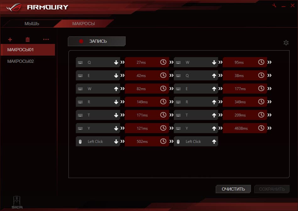 Мышь Asus Sica оснащена встроенной флеш-памятью, в которой пользователь может сохранять свои настройки и макросы. Созданные наборы команд можно назначить на правую кнопку мыши и на колесо прокрутки. Сохраненные параметры можно применить при подключении к различным ПК.