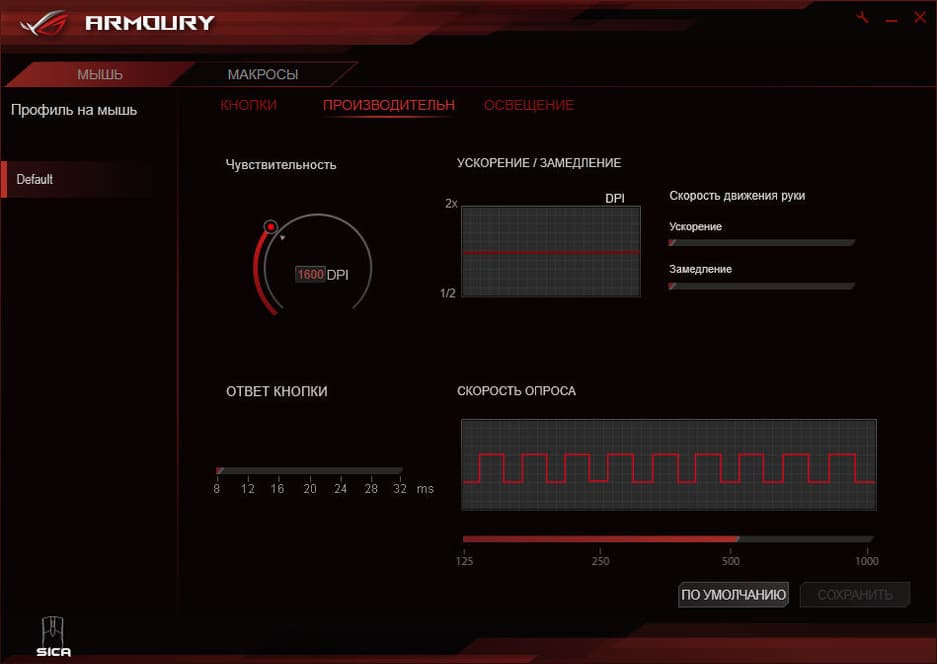 Для сохранения в единственном профиле пользователь может изменять разрешение оптического сенсора, частоту опроса порта USB и настраивать ускорение курсора по своему вкусу.