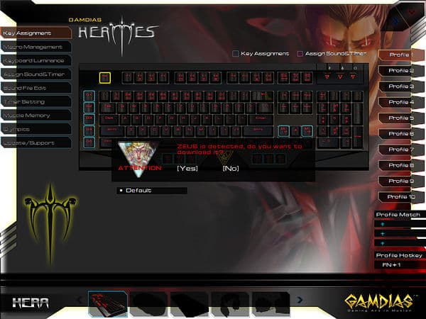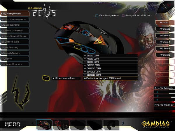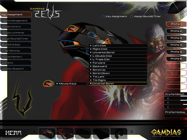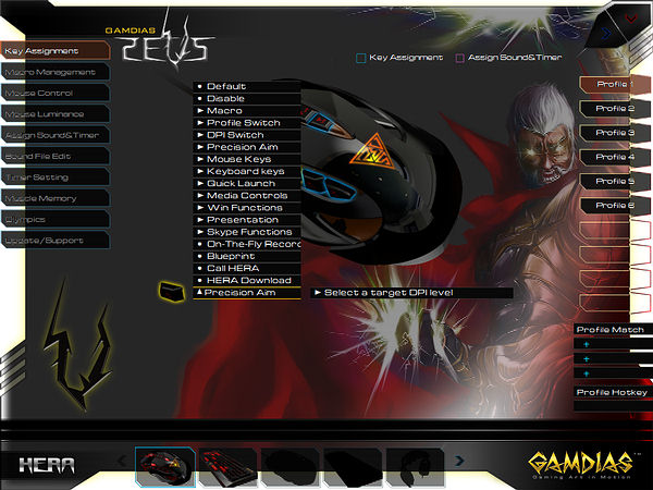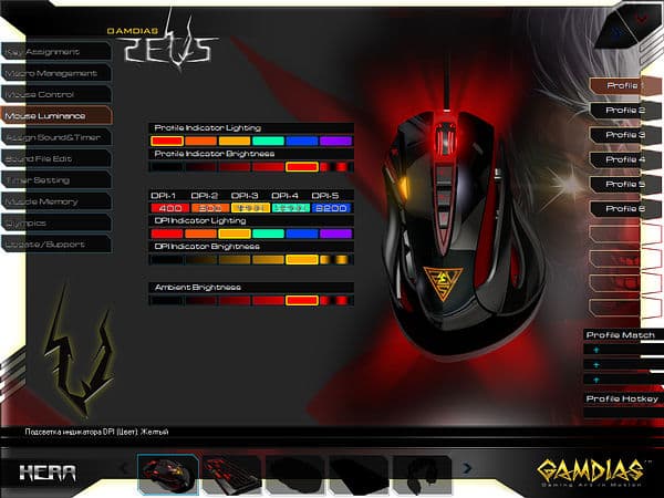 Первая вкладка позволяет настроить кнопки для каждого из 6 профилей (пустые слоты являются побочным эффектом унификации ПО: так, GAMDIAS Hermes поддерживает 10 профилей). По умолчанию для переключения используется кнопка ZI, но никаких препятствий к переназначению на любую другую кнопку нет, в случае задействования всех кнопок под другие функции можно воспользоваться интерфейсом HERA.