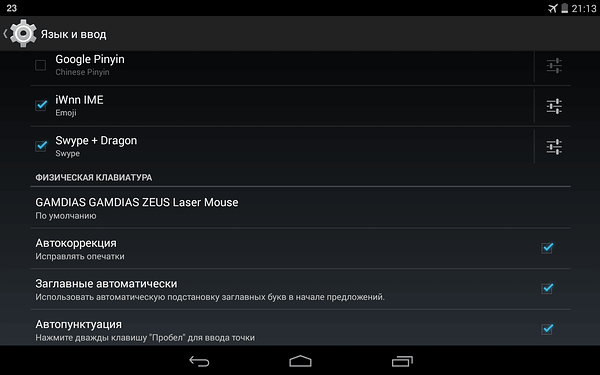 При подключении к планшету ASUS Nexus 7 2013 (версия Android 4.4.3) через OTG-кабель GAMDIAS Zeus, в отличие от GADIAS Hermes, маскирует свое происхождение, представляясь как GAMDIAS GAMDIAS Zeus Laser Mouse