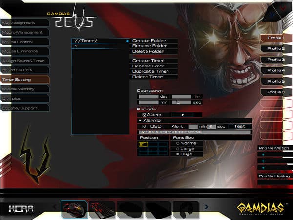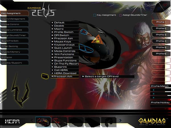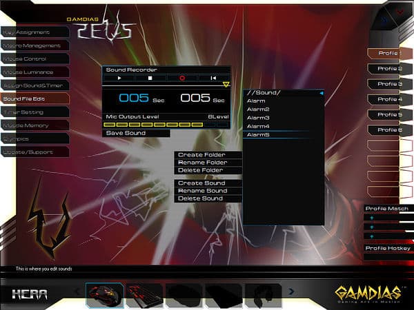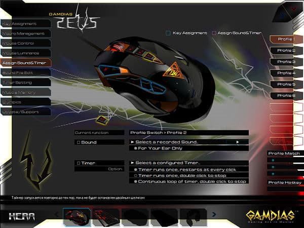 Оригинальной возможностью ПО от GAMDIAS является доступное в разделе «Assign Sound&Timer» назначение на любую кнопку однократного или продолжительного воспроизведения звуковых файлов или таймеров (также требует запуска HERA), опциональны перезапуск и прерывания по однократному и двукратному нажатиям.