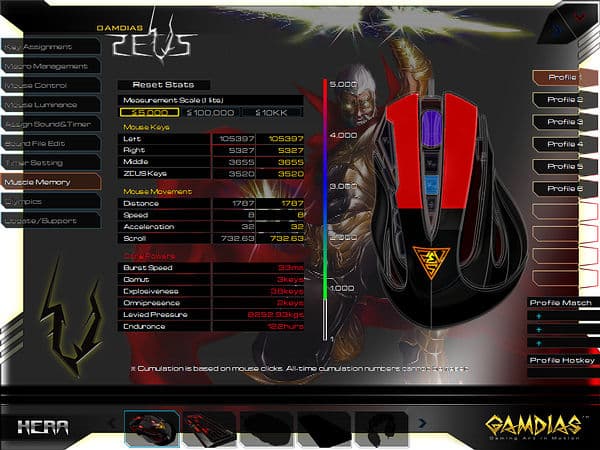 Вкладка «Muscle Memory» содержит статистику использования мыши, собираемую при запущенной программе HERA.