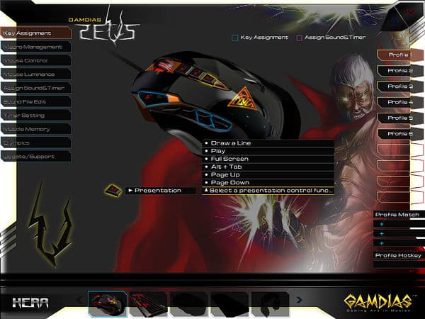 Характер устройства послужил причиной появления новых относительно доступных для GAMDIAS Hermes разделов — выбора разрешения сенсора «DPI Switch», активации фиксированного разрешения для более точного прицеливания «Precision Aim» и раздела «Presentation», отвечающего за поддержку функций Microsoft Office PowerPoint.