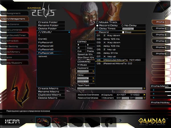 Вкладка «Macro Management» позволяет оперировать как с клавиатурой (сочетания с Windows-кнопкой обрабатываются корректно), так и с координатами курсора, возможна их установка вручную, поддерживаются запись и редактирование времени задержки при нажатии. Макрос может быть запущен одноразово, определенное количество раз, продолжительно или продолжительно с прерыванием по нажатию любой кнопки.