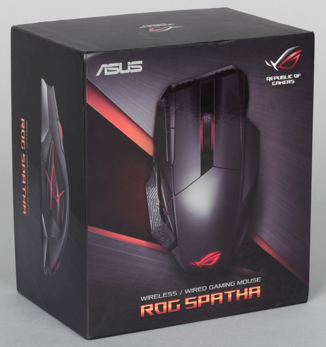 Мышь Asus ROG Spatha поставляется в компактной картонной коробке, оформленной в тёмных тонах. Внутри расположен чехол для транспортировки, а уже в нём на посадочных местах находятся: