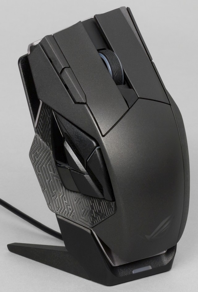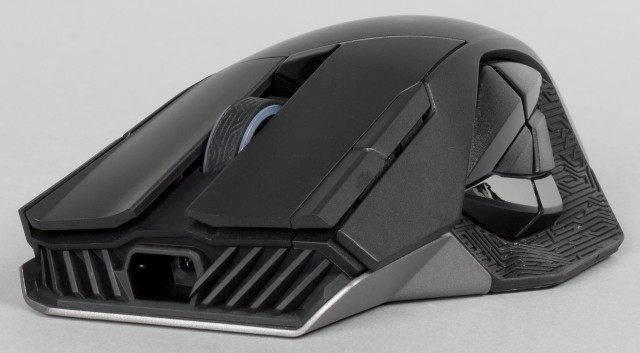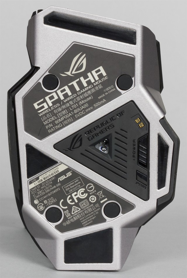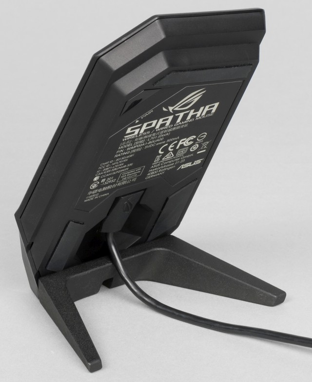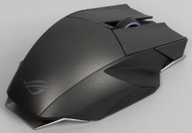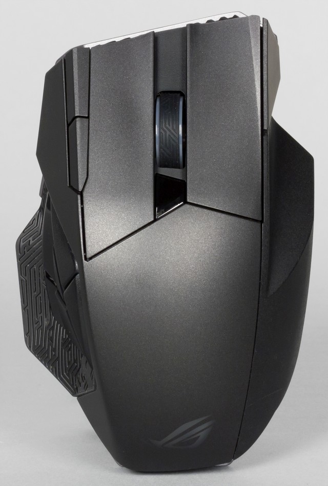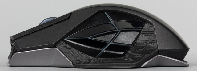 Как левый, так и правый бок манипулятора имеет вставку в виде резиновой рельефной панели. На ближней к запястью пользователя части мыши размещён логотип ROG, оснащённый подсветкой. Основные кнопки Spatha отделены от корпуса и по форме сужаются ближе к переднему краю устройства.