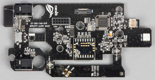 К сожалению, тактильно разница в покрытиях и формах этих кнопок практически не ощущается. Через щели между боковыми кнопками проходит свет от светодиода. Подсвеченные щели образуют стилизованный глаз ROG. Для шести кнопок под большой палец используются переключатели Alps.