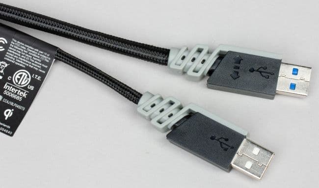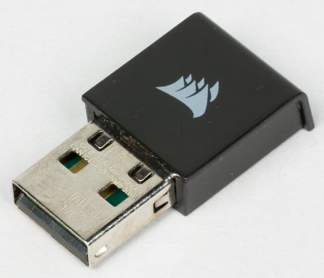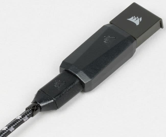 Раздваивающийся интерфейсный кабель защищён толстой текстильной оплёткой. Штекер USB 3.0 используется для реализации сквозного порта, а штекер для работы блока беспроводной зарядки можно подключать к порту USB 2.0. Форма и цвет штекеров традиционны для периферии Corsair.