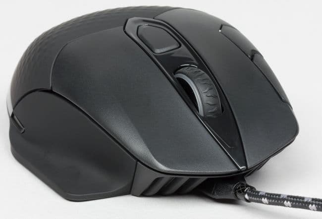 Ладонью эта текстура едва ощущается, но эффект интересный. Передняя часть манипулятора выполнена из гибкого пластика, слегка приподнятого над верхней поверхностью мыши. Между ЛКМ и ПКМ расположено колесо прокрутки диаметром 24 мм, выступающее над поверхностью корпуса манипулятора. Обод колеса прокрутки прорезинен и снабжён рельефом.