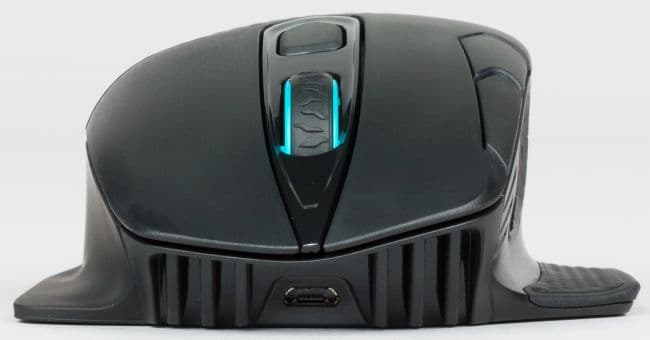 На фронтальной части мыши, ближе к нижней части, расположен порт для зарядки устройства посредством кабеля USB.