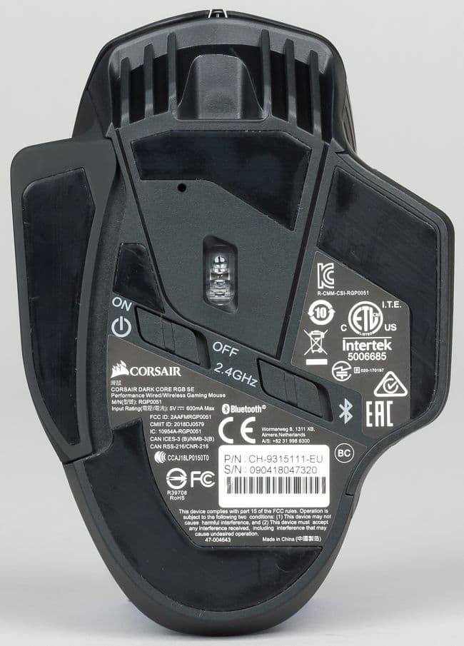 На днище мышки расположены два переключателя: один отвечает за включение/выключение мышки, а второй за выбор интерфейса беспроводного подключения к ПК — через радиоканал 2,4 ГГц или через Bluetooth. Также на днище расположены одна маленькая и четыре большие пластины, по свойствам похожие на тефлон, которые позволяют мышке комфортно скользить по поверхности стола или коврика.