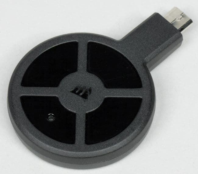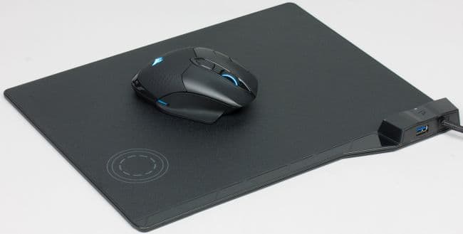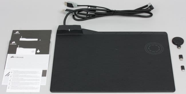 В левой верхней части расположен блок питания коврика и сквозной порт USB 3.0, к которому можно подключать различные периферийные устройства, например беспроводный адаптер мышки Corsair Dark Core RGB SE. Если используется беспроводная зарядка, то на блоке питания коврика мигает зелёный светодиод.