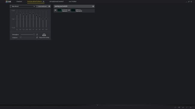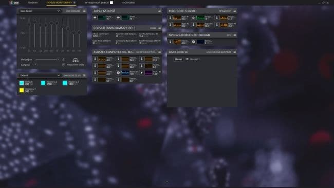 В панель «Мониторинг» вынесена вся важная информация о ваших периферийных устройствах Corsair, уровень заряда беспроводных устройств, настройки звуковых профилей наушников и т. д.