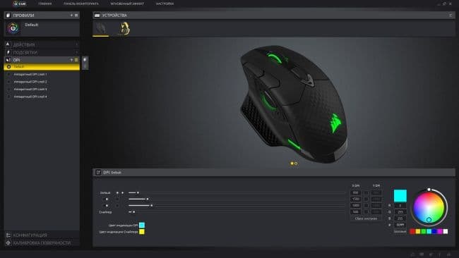 Во вкладке DPI можно настроить три уровня чувствительности для каждого профиля, а также режим подсветки для индикации текущего разрешения оптического сенсора. Если вы играете при запущенном приложении iCUE и выбрали профиль по умолчанию, то смена профилей кнопкой на спине мыши не осуществляется, а вот если был выбран один из настроенных пользователем профиль, то можно переключаться между созданными профилями. При этом профиль может содержать и настройки для гарнитуры, например. Имеется возможность создавать подпрофили, но нет возможности присвоить их активацию на какую-либо кнопку мыши. Поэтому переключение нужно делать с помощью iCUE.