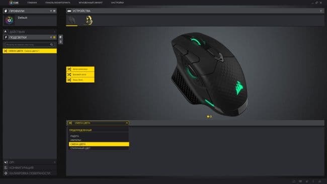 Внешний вид и функциональные возможности фирменного ПО от Corsair претерпели значительные изменения. Появилась новая вкладка «Мгновенный эффект», в которой пользователь может назначить один цвет подсветки сразу для всех подключенных устройств Corsair, поддерживающих RGB-подсветку, конечно.