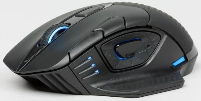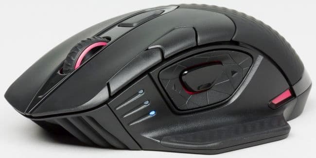 По левому краю ЛКМ размещены две дополнительные кнопки, которые отвечают за смену разрешения оптического сенсора. Настроить уровни чувствительности можно через утилиту iCUE. Индикатором выбранного уровня чувствительности является количество горящих светодиодов на левом боку мыши.