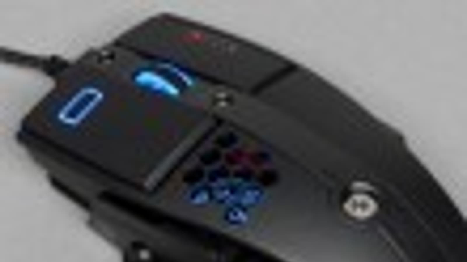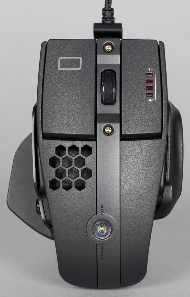 Основные клавиши мыши слегка приподняты над корпусом и имеют разную площадь. Площадь левой клавиши заметно больше площади правой. Кроме того, на левой клавише расположен небольшой прямоугольник, чей контур сделан из полупрозрачного пластика, через который проходит свет от подсветки.