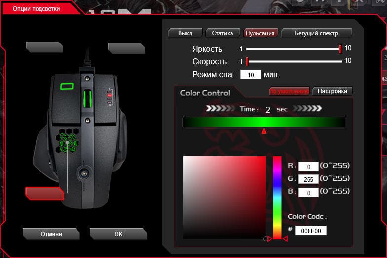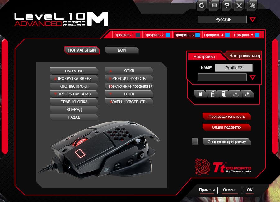 Фирменное приложение предлагает хороший ассортимент настроек макросов и назначаемых стандартных действий. При желании можно привязать любой профиль к выбранному приложению. В манипуляторе Level 10 M Advanced реализована полноцветная подсветка, но вот с доступными к использованию режимами её работы не густо. Доступны лишь три варианта — статичный, пульс и бегающий спектр (радуга).