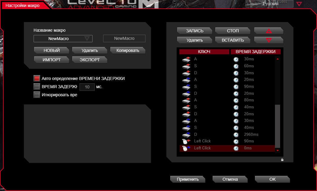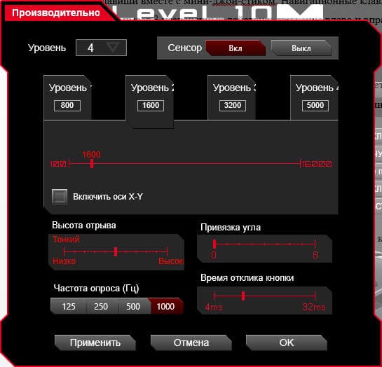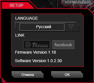 На официальном сайте можно скачать фирменное приложение для настройки подсветки, макросов и профилей манипулятора. Приложение имеет простой интерфейс с русской локализацией. Некоторые шрифты стоило бы уменьшить, тогда в отведённое пространство влезало бы всё, что требуется. Например, номера уровней разрешения при текущей величине шрифтов обрезаются, что портит общее впечатление.