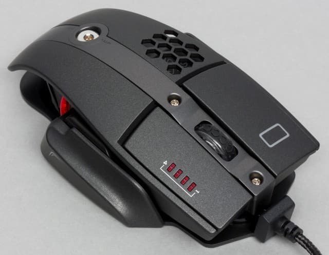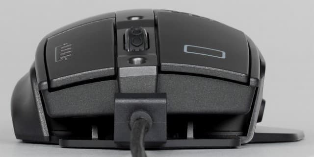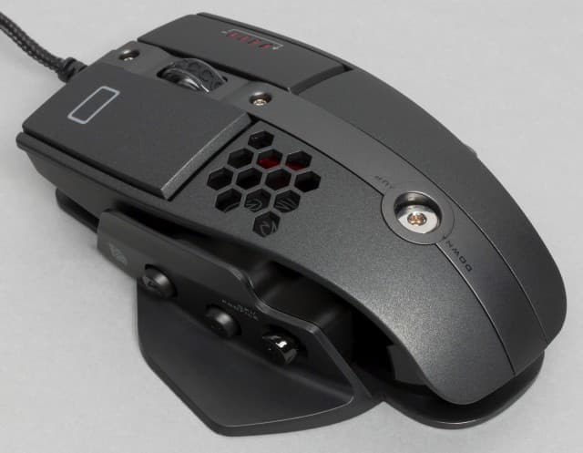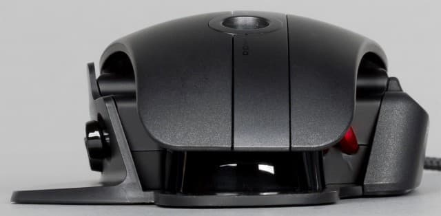 Левый бок мыши оснащён дополнительным ложем для большого пальца, двумя навигационными клавишами и мини-джойстиком. Навигационные клавиши обозначены литерами А и В. Джойстик имеет три назначенных действия: движение влево и вправо меняет значение DPI. Нажатие на джойстик меняет профиль мышки. К джойстику приходится тянуться большим пальцем, максимально подгибая его. На движение вверх и вниз действия не назначены. На правом боку манипулятора имеется выступ для расположения мизинца.