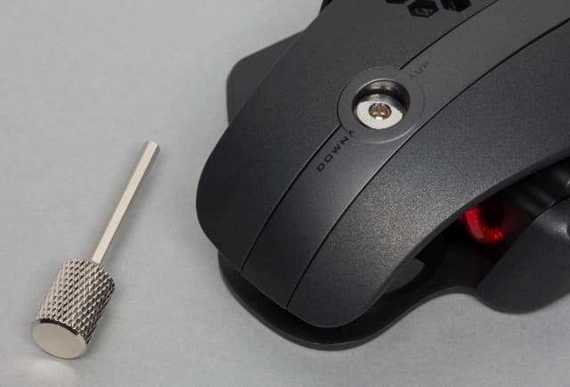 На ближней к пользователю части мыши виден серебристый разъём под ключ, с помощью которого можно регулировать степень прижима пружинного механизма и тем самым менять высоту задней части Level 10 Advanced относительно стола.