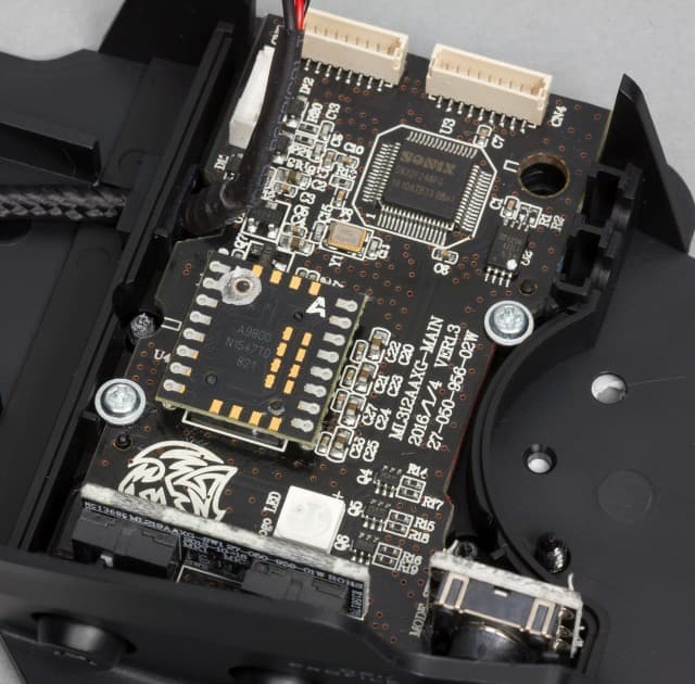 Заглянем внутрь. Хорошо видна маркировка оптического сенсора Pixart 9800, совмещённого с лазерным источником света.