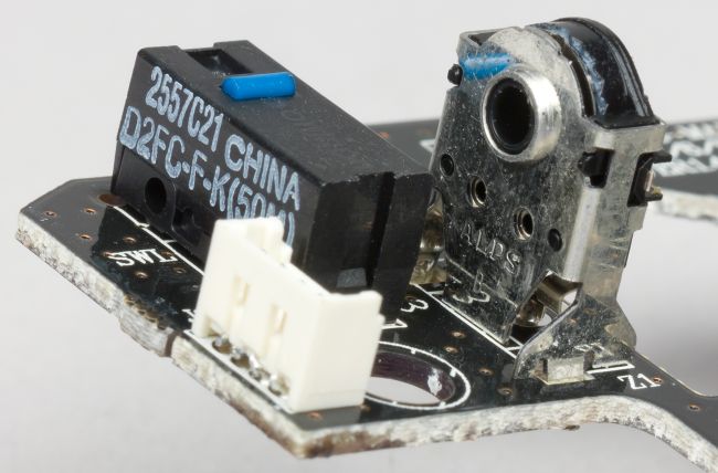 Тут можно разглядеть маркировку переключателя Omron — D2FC-F-K (50M), его ресурс — 50 миллионов нажатий.