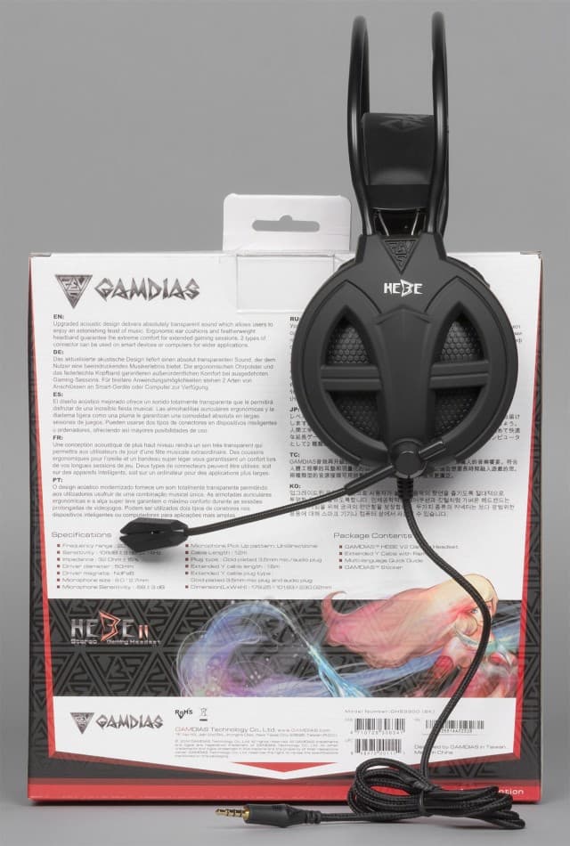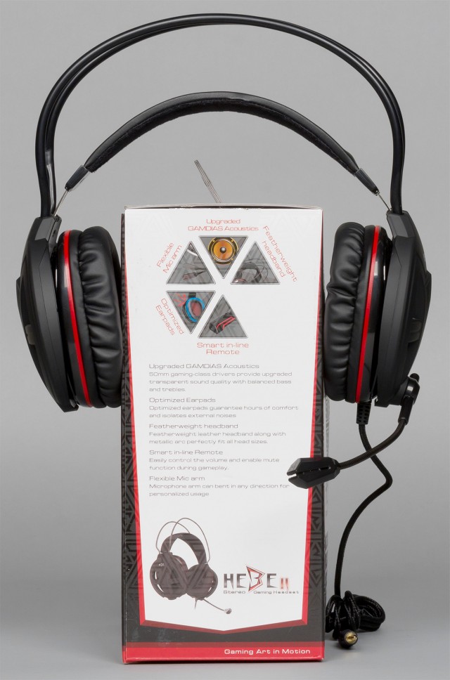 Гарнитура Gamdias Hebe v2 продается в типичной картонной коробке в светлых тонах, половина лицевой стороны которой представляет собой прозрачное окно из пластика. Через окно хорошо видна сама гарнитура. На поверхностях коробки есть изображение гарнитуры, спецификации, ключевые особенности и логотип Gamdias в виде перевернутого треугольника, в который вписано имя верховного древнегреческого бога Зевса (Zeus).