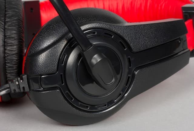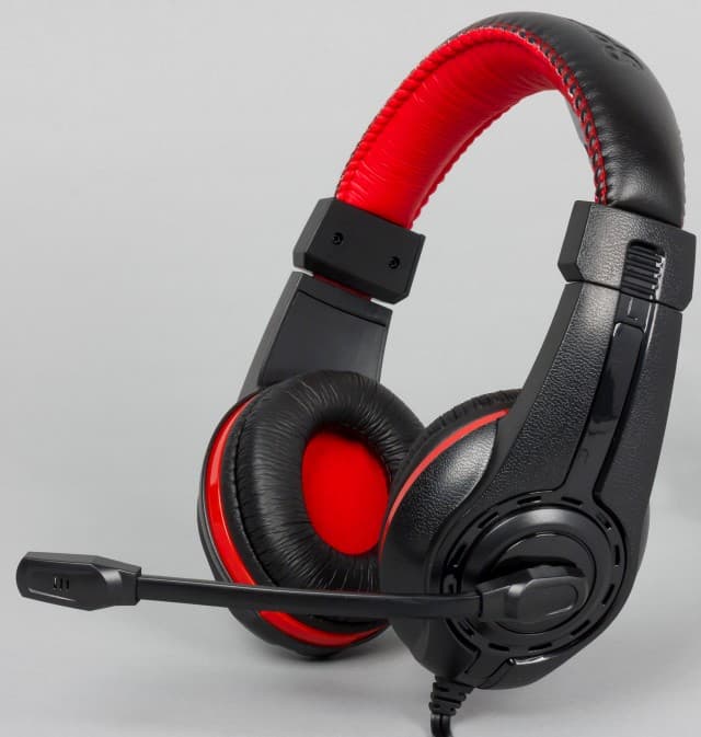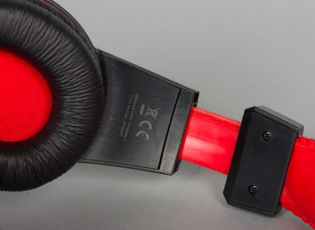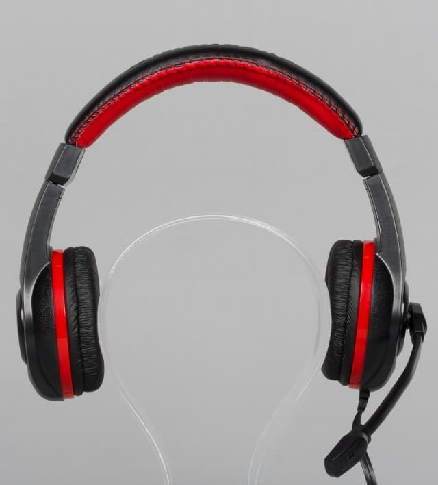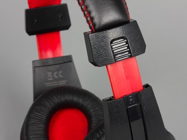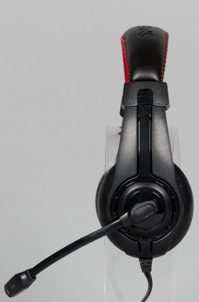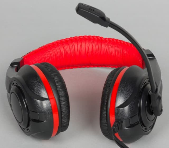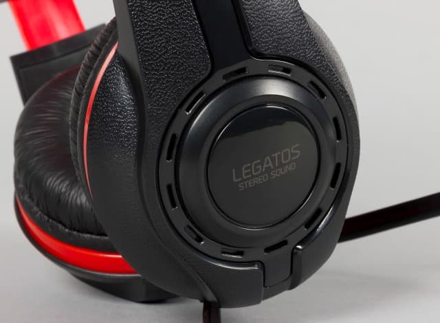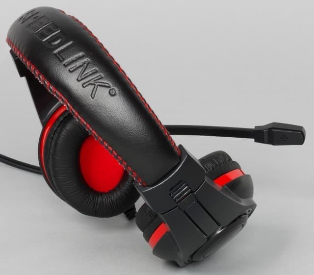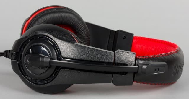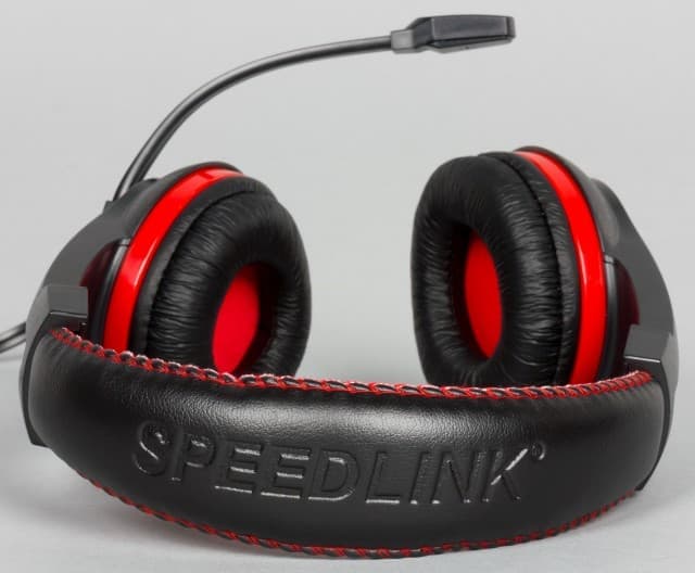 Оголовье Speedlink LEGATOS изготовлено из жёсткого упругого пластика. Никаких дополнительных элементов для регулировки силы прижима не предусмотрено. Оголовье закрыто элементами из мягкой искусственной кожи, внутри которых есть вставка из поролона. Отметим, верхняя часть чёрного цвета с логотипом компании, а нижняя — красная. Когда гарнитура находится на голове, то ярких элементов почти не видно.