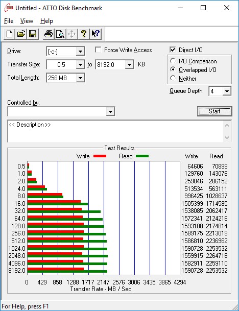 Для накопителя Samsung MVNe MZVPV512 утилита ATTO Disk Benchmark определяет максимальную скорость последовательного чтения на уровне 2,2 ГБ/с, а последовательной записи — на уровне 1,5 ГБ/с. Для одиночного накопителя это очень высокие результаты.