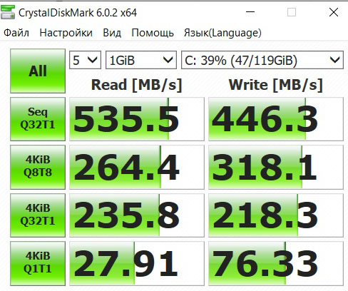 Оба накопителя используют SATA-III. Мы протестировали их с помощью утилиты CrystalDiskMark. Очевидно, что твердотельный накопитель будет использоваться только для операционной системы и основных приложений, а местом для игр станет винчестер. Это повлияет на скорость их загрузки, но не на производительность.