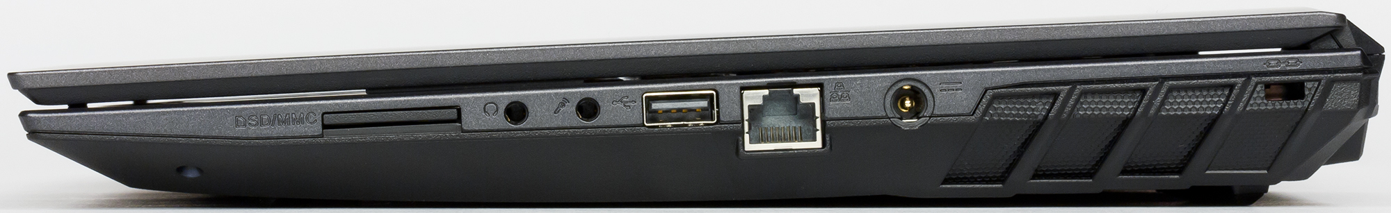 На правой — разъём для адаптера питания, сетевой разъём RJ-45, USB 2.0, Kensington Lock, 3,5-миллиметровый выход для наушников, микрофонный вход и слот кардридера.