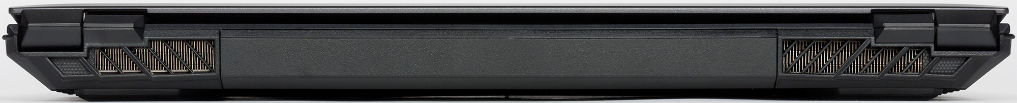 Корпус ноутбука выполнен из тёмного пластика. Дизайн простой, немного угловатый. Принадлежность ноутбука к категории игровых машин выдают только скошенные вентиляционные отверстия на боковых и тыловой панелях корпуса.