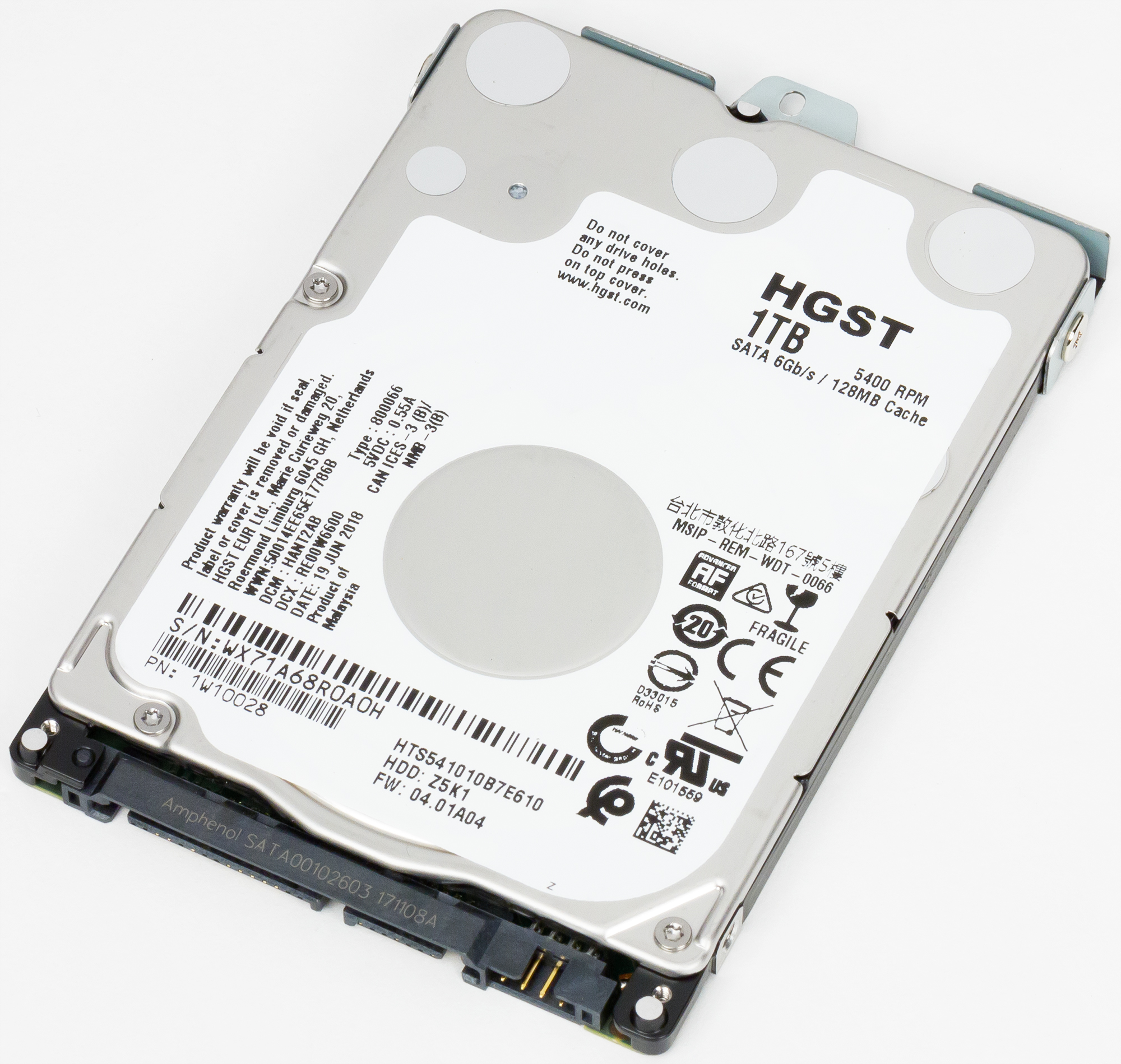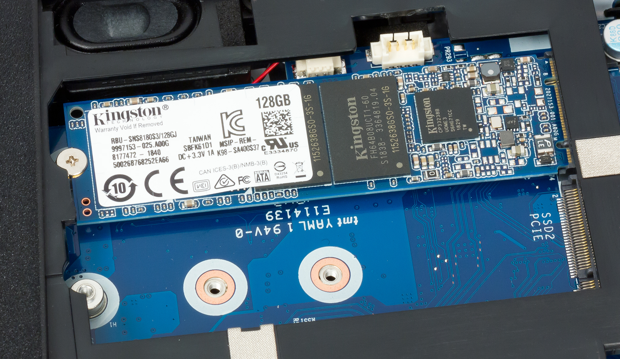 На материнской плате есть два разъёма форм-фактора M.2 2280 для подключения твердотельных накопителей. В первом слоте установлен SSD Kingston на 128 ГБ. Второй слот пустой, что даёт возможность поставить ещё один SSD. Также в ноутбуке установлен жёсткий диск HGST HTS541010B7E610 объёмом 1 ТБ со скоростью вращения шпинделя 5400 оборотов/мин.