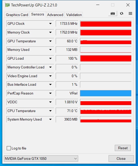На скриншоте ниже видно, как ведёт себя видеокарта во время стресс-теста. Частота работы памяти составляет 1752 МГц, а частота GPU — 1733 МГц при стабильной температуре в 60 градусов. Частота GPU GTX 1050 при использовании технологии Boost составляет до 1493 МГц. Так что здесь налицо небольшой разгон.