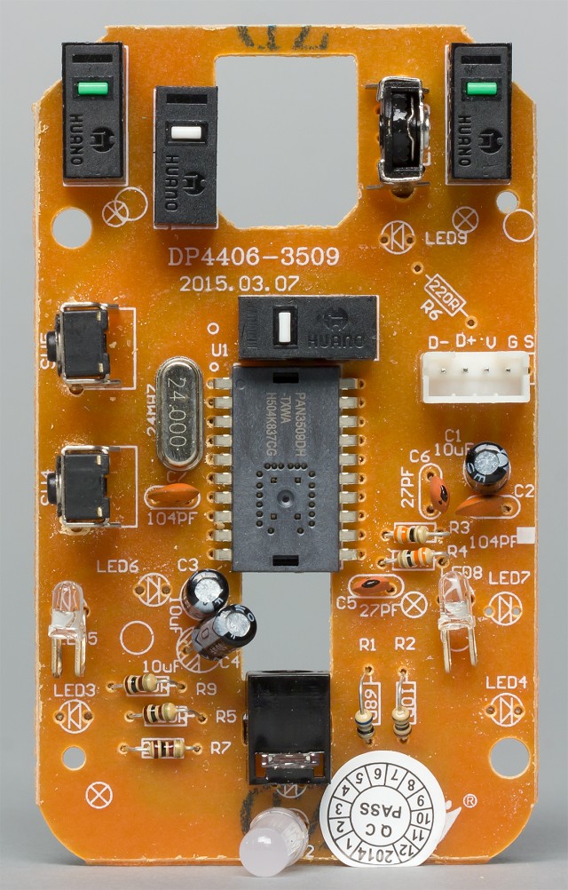 Заглянем внутрь. Здесь применен оптический сенсор PixArt PAN3509DH, который совмещен с управляющим контроллером.