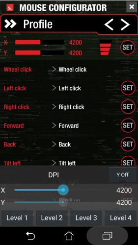 Со смартфона можно изменять разрешение оптического сенсора мыши для каждого профиля. В целом интерфейс мобильного приложения прост и интуитивно понятен, но русификации, так же как и в настольном приложении, не реализовано.